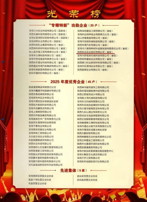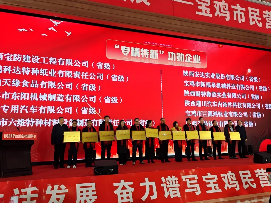 2026年1月28日下午,在宝鸡市民营企业协会主办的“凝心聚力•共话发展”2026迎新年会上,陕西安达实业股份有限公司被授予“‘专精特新’功勋企业”荣誉称号。